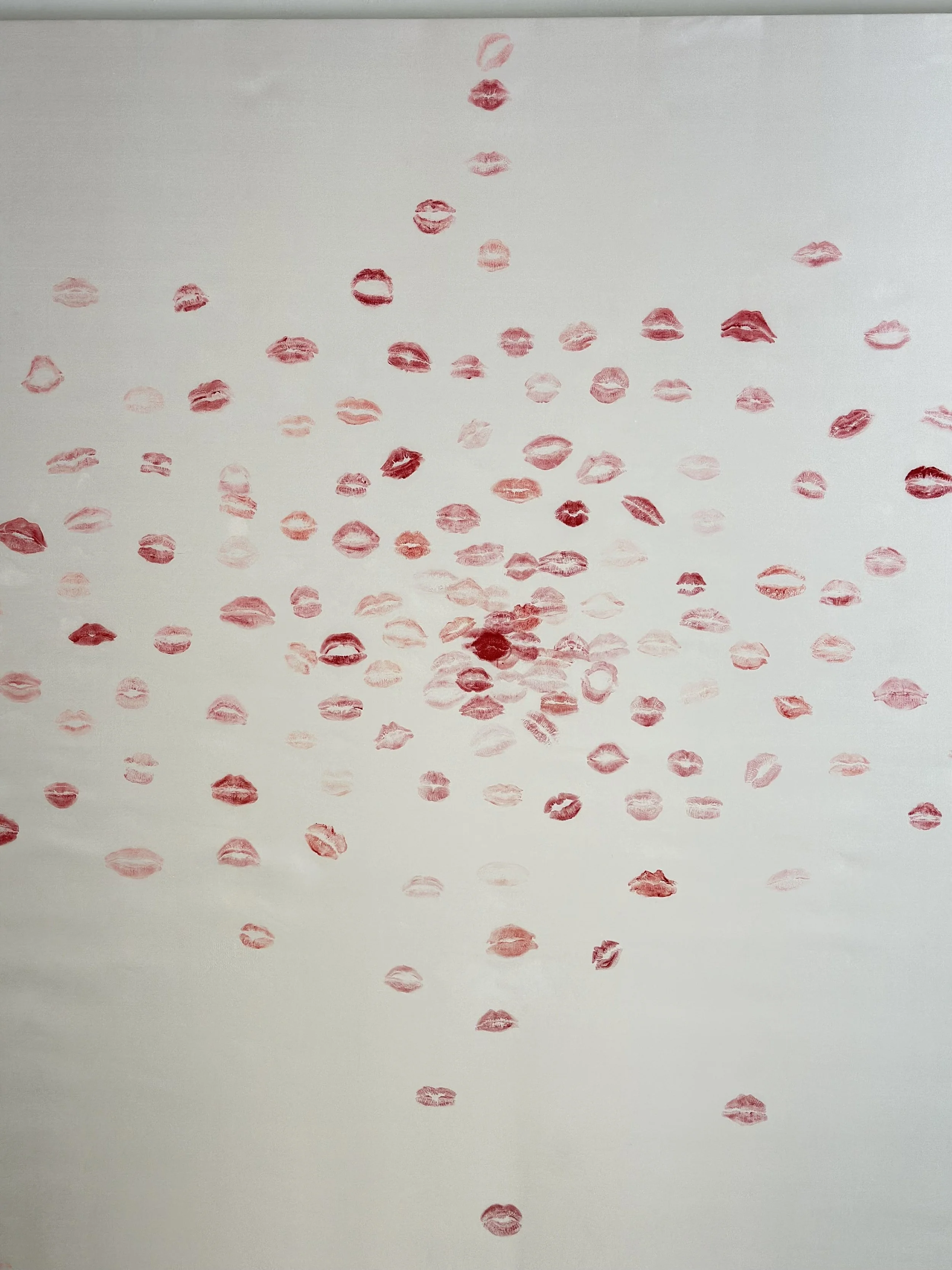 Participants are invited to remove their makeup and apply the red lipstick, observing their unique lip prints as a form of individual identity, comparable to a tax ID or a bank code. Each person then leaves one of 666 kisses on a 333cm white silk canvas. This act represents the duality of the human condition: the tension between the "666" (our darker, destructive tendencies) and our capacity to reach for the divine through positive actions and social collaboration. By stamping their lips, participants leave an indelible mark on art history, transforming a personal gesture into a collective statement.